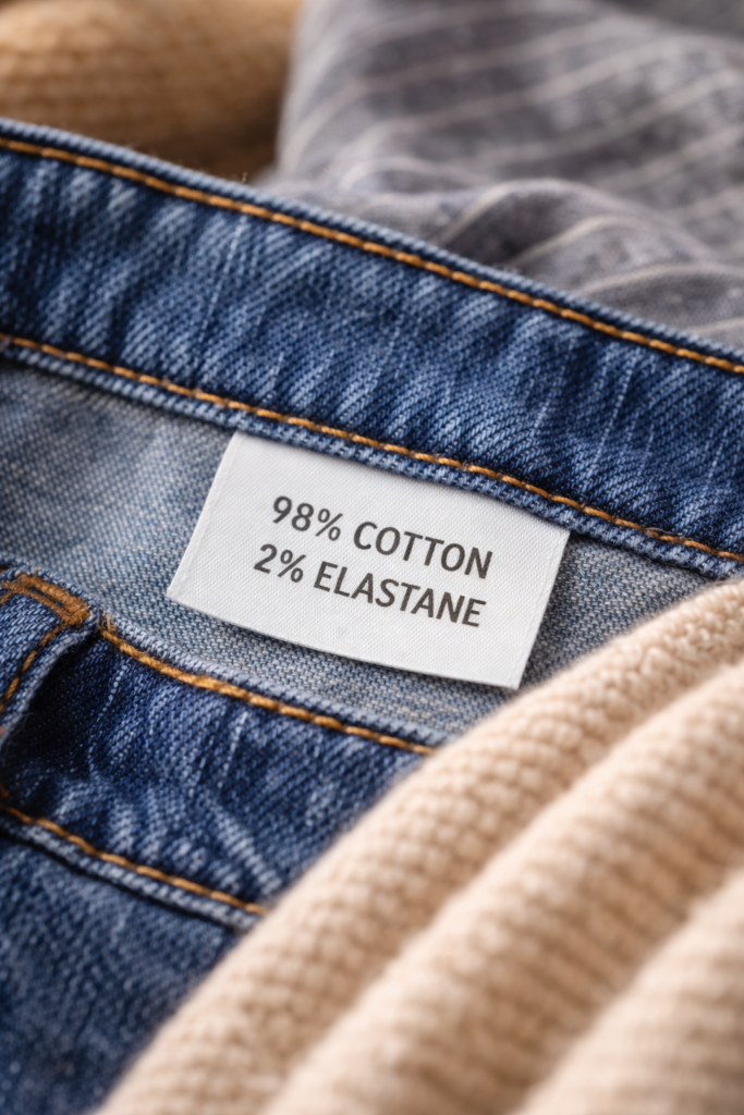 - bawełny (np. jeansy 98% bawełna, 2% elastan),